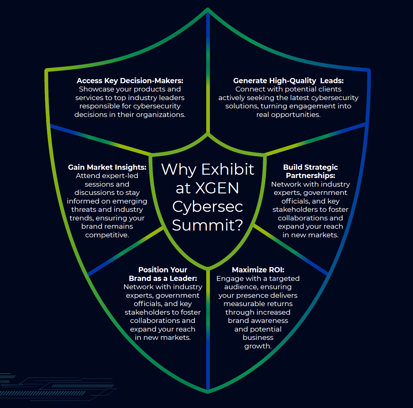 Discover the strategic advantages of exhibiting at the XGEN Cybersec Summit. From gaining access to top cybersecurity decision-makers and generating high-quality leads to maximizing ROI and forging powerful industry partnerships — this summit offers unmatched opportunities to elevate your brand and expand your market presence.